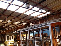 | Het door de storm van januari deels verwoeste doek van de restauratie-werkplaats 't Tremmencentrum is door een aannemersbedrijf hersteld. Het open gedeelte op de foto is transparante beplating. Daardoor krijgen de restauratieprojecten meer licht, wat natuurlijk overdag veel scheelt aan energie. Met de nog goede beplating is de rest van het dak gerepareerd. | ![]() F: Tim Castricum |