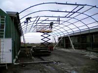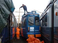 Het provisorische dak op de openluchtremise vordert gestaag. De tijdelijke opbouw moet de trams die nu een jaar in de buitenlucht bivakkeren beschermen tegen de weersinvloeden. De constructie bestaat uit houten spanten die verticaal gericht worden en een driehoeksframe dat het landbouw-zeil zal gaan dragen. De verticale spanten worden met horizontaal gerichte spanten gekoppeld. De helft van de constructie staat inmiddels. |