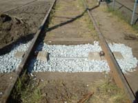 Om alvast kennis te maken met het plaatsen ervan, is op dinsdag 31 mei 2005 een proef-plaatsing verricht naast de werk-plaats in het hoofdspoor. De dwars-ligger bestaat uit twee betonnen voetstukken met pasplaatjes voor diverse spoorprofielen, onderling verbonden met een gegalvaniseerde stalen buis. |
